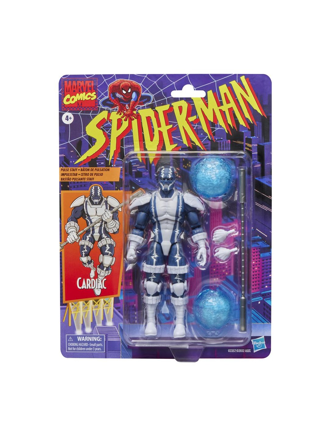 Hasbro añade a su línea Marvel Legends Series esta figura retro del Dr. Elias Wirtham transformado en el justiciero Cardiac, inspirada en su aparición en los cómics de "Spider-Man". Mide 15 cm y cuenta con más de 20 puntos de articulación. Incluye 2x manos intercambiables, 1x bastón Beta y 2x efectos de combate. Su diseño premium refleja el característico traje tecnológico del personaje. Se presenta en embalaje tipo blíster con estética clásica.