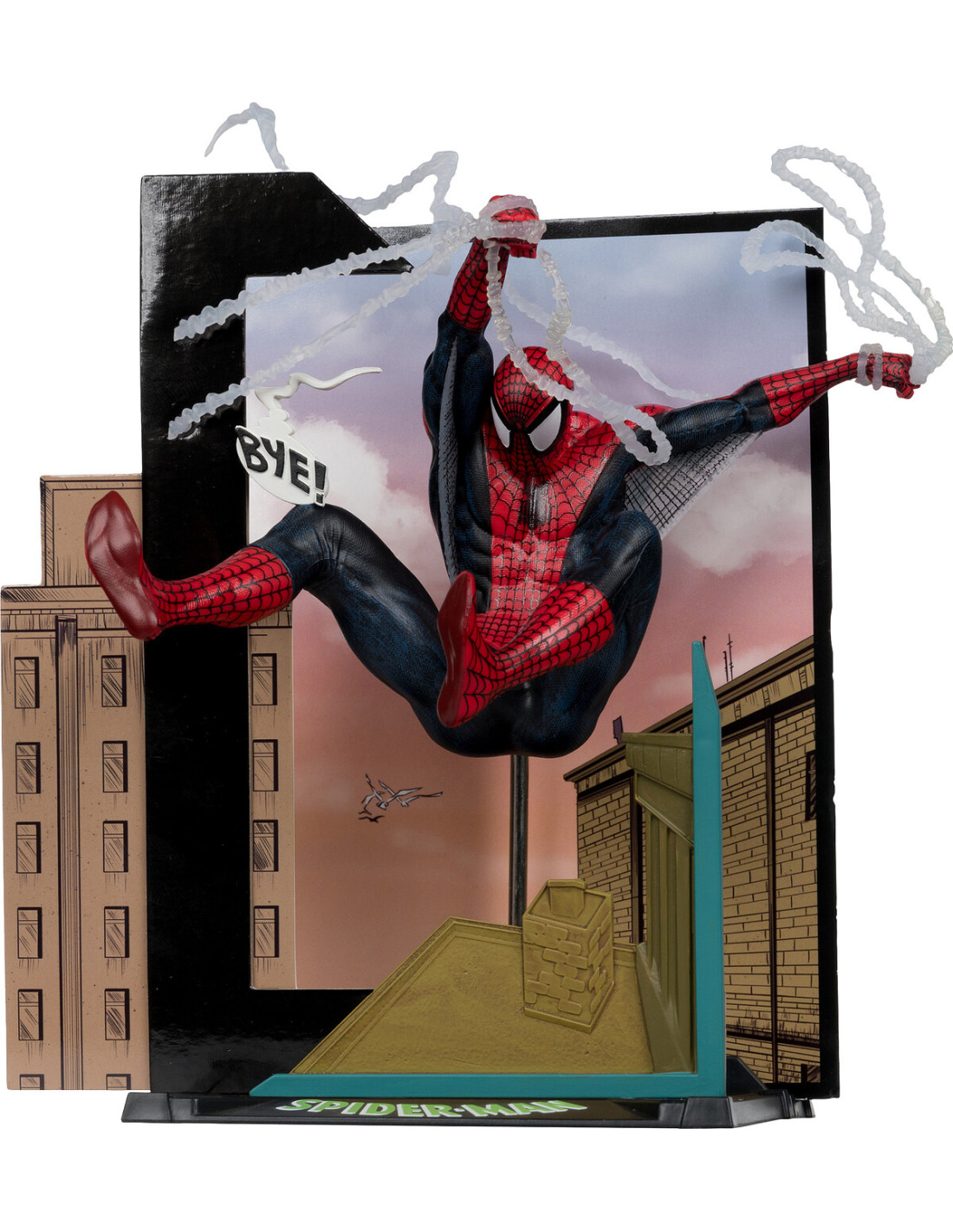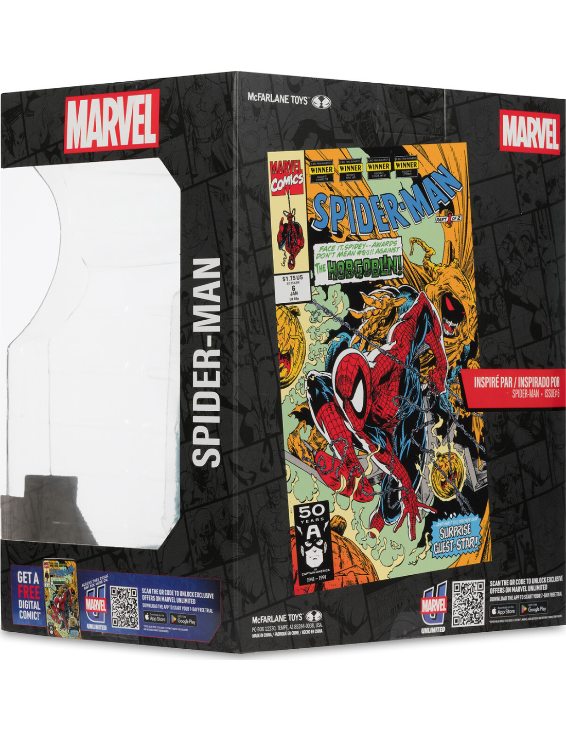 McFarlane Toys presenta en su línea Marvel Collection la figura de Spider-Man, inspirada en la página 11 del cómic "Spider-Man #6" de 1991. Esta pieza a escala 1:10 recrea una escena icónica del enfrentamiento contra Hobgoblin. Mide aproximadamente 18 cm e incluye 1x base ambiental, 1x fondo decorativo, 1x tarjeta coleccionable y 1x ilustración del personaje. Se presenta en una caja con ventana con ilustraciones de la escena integrada y se incluye un código QR para poder descargar gratuitamente el cómic en formato digital.